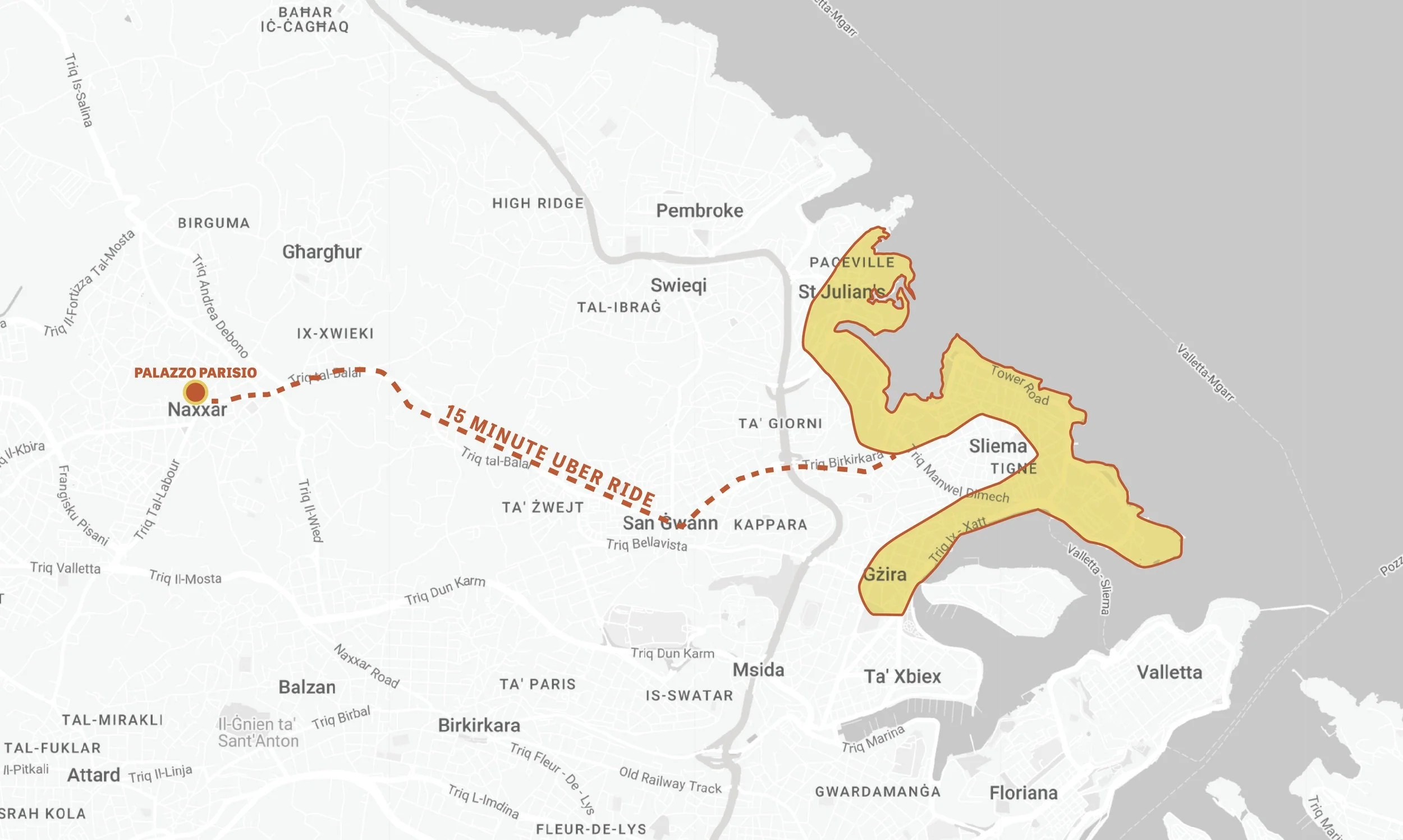 We recommend staying along the eastern coast of Malta in Gżira, Sliema, or St. Julian. Palazzo Parisio is a short 15 minute Uber ride from these areas.